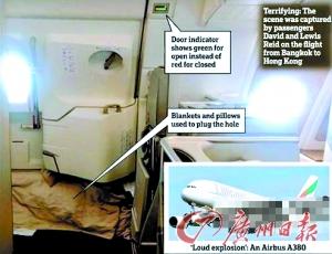 該班編號EK384的肇事A380空中巴士,年初二下午由曼谷起飛往香港。英國傳媒引述英國乘客里德形容,他與兒子坐在飛機上層商務(wù)客艙,航行了2小時(shí),突聞一聲巨響及感到震動(dòng),以為發(fā)生爆炸,并目睹緊急逃生門(mén)半開(kāi),露出約3.5厘米的門(mén)縫,有空姐嚇得目瞪口呆,臉色發(fā)白;也有空姐走出通道,以對講機大叫“門(mén)快要打開(kāi)了”,然后躲在座位下。