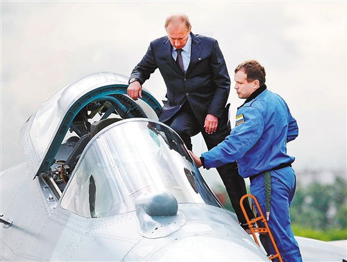 俄羅斯首都莫斯科市郊外的茹科夫城,普京(左)參觀(guān)由俄羅斯蘇霍伊公司研制的第五代隱形戰斗機T-50。 新華社發(fā)