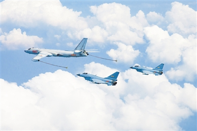 5月12日,南空航空兵某團組織帶有戰術(shù)背景的空中對抗演練。圖為殲擊機在進(jìn)行空中加油。 本報特約記者 賁道春攝