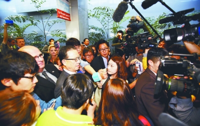 韓亞航空公司社長(cháng)尹永斗(中左)抵達美國舊金山國際機場(chǎng)后接受媒體采訪(fǎng)。新華社/路透