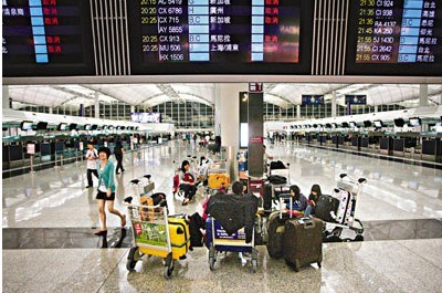 香港機場(chǎng)更陷入癱瘓狀態(tài),截至22日晚9時(shí),共有370班客機取消,76班客機延誤。雖然國泰及港龍航空早在30小時(shí)前,于臺風(fēng)到達香港范圍前一日,已宣布取消22日下午6時(shí)后所有航班,但在機場(chǎng)離境大堂內仍有大量旅客等候辦理候補機位,希望盡快離港。