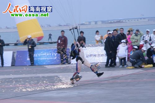 17日上午,2011環(huán)海南飛行拉力賽在?谂e行了隆重的開(kāi)幕儀式。直升機同心圓旋轉、模型機超低空飛行、跳傘隊上演“七仙女下凡”……八一跳傘隊、河南跳傘隊、翱翔中國航空模型特技飛行表演隊等在萬(wàn)綠園旁人工島上演了一場(chǎng)華麗的飛行表演秀,一系列超乎想象的精彩表演讓現場(chǎng)觀(guān)眾嘆為觀(guān)止。