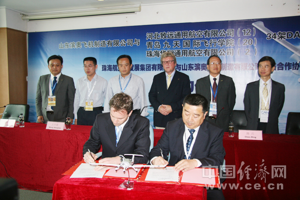 中國經(jīng)濟網(wǎng)珠海航展特派記者團 記者王飛 11月16日報道 15日,山東濱奧飛機制造有限公司在珠海航展上分別與河北致遠通用航空有限公司、青島九天國際飛行學(xué)院、珠海華翔通用航空有限公司簽署總共銷(xiāo)售34架DA40飛機購機合同定單,并同時(shí)與珠海航空城簽署戰略合作協(xié)議。