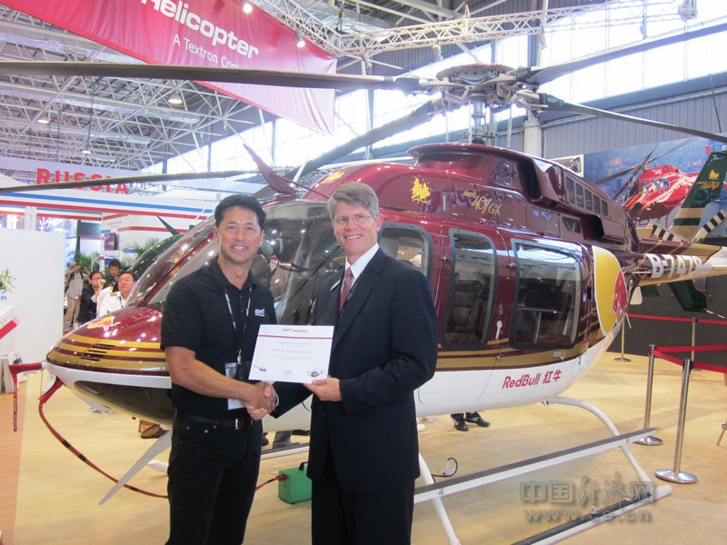 中國經(jīng)濟網(wǎng)珠海航展特派記者團訊 著(zhù)名演員兼明星飛行員王敏德獲得貝爾直升機公司總裁兼首席執行官約翰·加里森頒發(fā)“貝爾直升機中國大使”證書(shū)。王敏德將代表貝爾直升機公司出席各類(lèi)活動(dòng)。王敏德是一名合資格的飛行員, 持有貝爾直升機飛行執照。