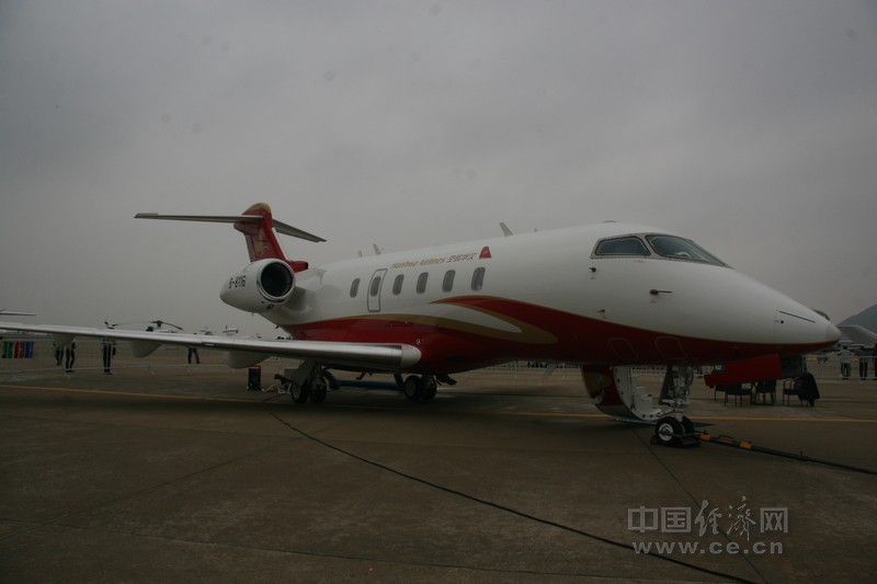 中國經(jīng)濟網(wǎng)珠海航展記者團記者王飛報道 漢華航空有限公司引進(jìn)的第2架挑戰者300公務(wù)機在珠海航展進(jìn)行靜態(tài)展示,該機編號B-8116,系加拿大龐巴迪公司出品。