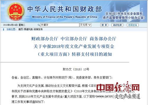 經(jīng)濟日報-中國經(jīng)濟網(wǎng)北京4月24日訊 近日,財政部辦公廳、中宣部辦公廳和商務(wù)部辦公廳聯(lián)合下發(fā)了關(guān)于申報2018年度文化產(chǎn)業(yè)發(fā)展專(zhuān)項資金(重大項目方面)轉移支付項目的通知(以下簡(jiǎn)稱(chēng)“通知”)。根據通知,專(zhuān)項資金將直接補助推動(dòng)影視產(chǎn)業(yè)發(fā)展和對外文化貿易發(fā)展的重大項目。