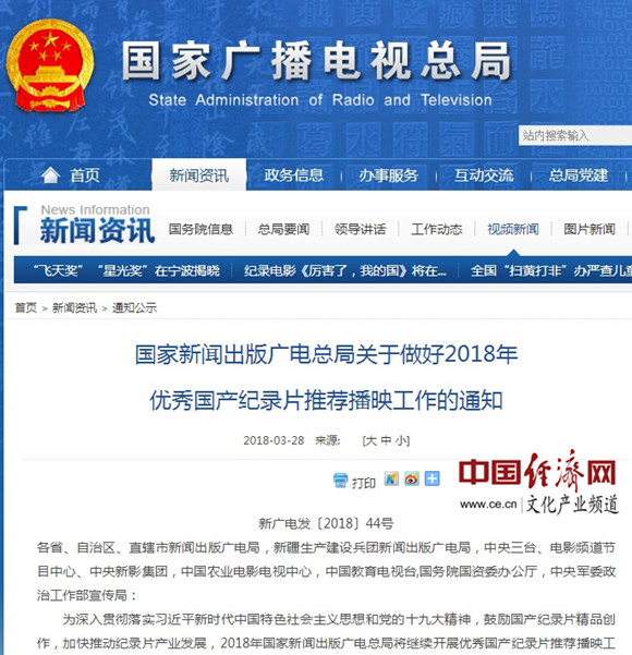 國家新聞出版廣電總局關(guān)于做好2018年優(yōu)秀國產(chǎn)紀錄片推薦播映工作的通知