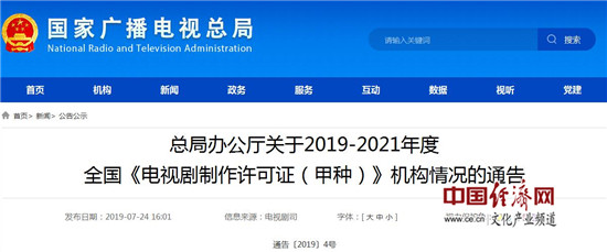 經(jīng)濟日報-中國經(jīng)濟網(wǎng)北京7月30日訊 日前,廣電總局公布2019-2021年度《電視劇制作許可證(甲種)》機構名單。中國電視劇制作中心有限公司、中國電影股份有限公司、中國國際電視總公司等73家機構入選。