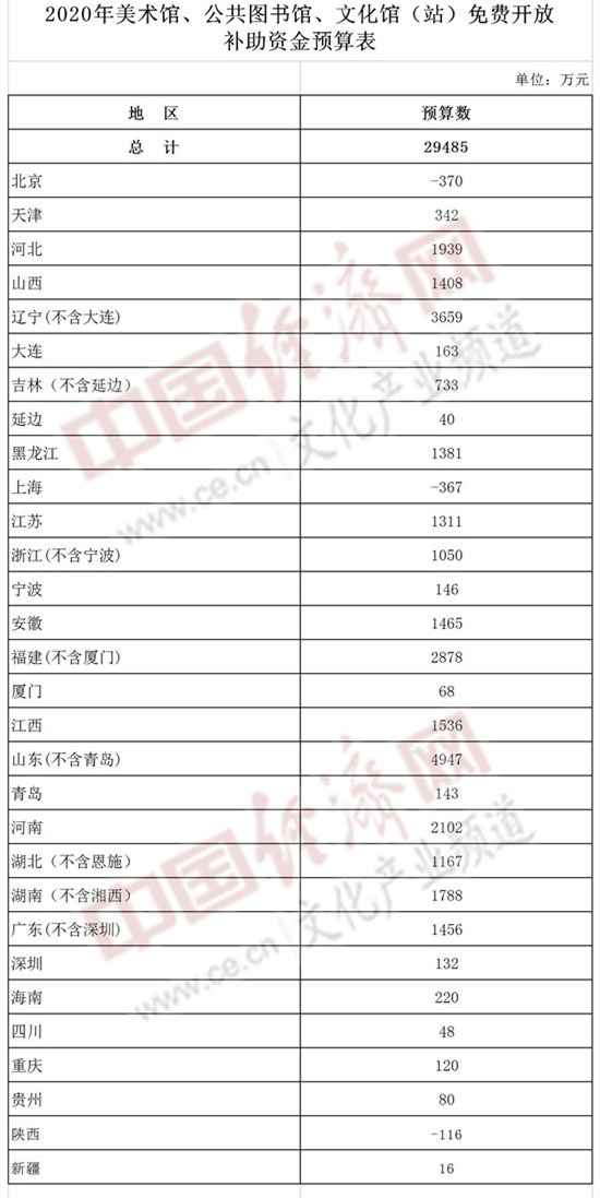 經(jīng)濟日報-中國經(jīng)濟網(wǎng)北京8月4日訊 8月4日,財政部官網(wǎng)發(fā)布了《關(guān)于下達2020年美術(shù)館、公共圖書(shū)館、文化館(站)免費開(kāi)放補助資金預算的通知》(以下簡(jiǎn)稱(chēng)“通知”),據通知附件《2020年美術(shù)館、公共圖書(shū)館、文化館(站)免費開(kāi)放補助資金預算表》顯示,2020年美術(shù)館、公共圖書(shū)館、文化館(站)免費開(kāi)放補助資金預算為2.9485億。