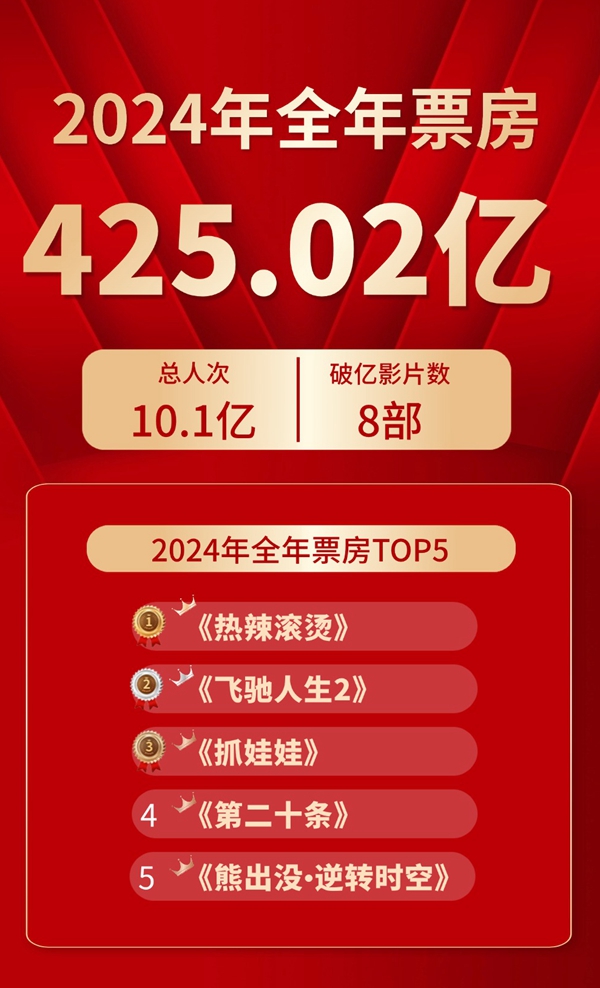 425.02億 !2024年全國電影票房公布 8部影片破10億