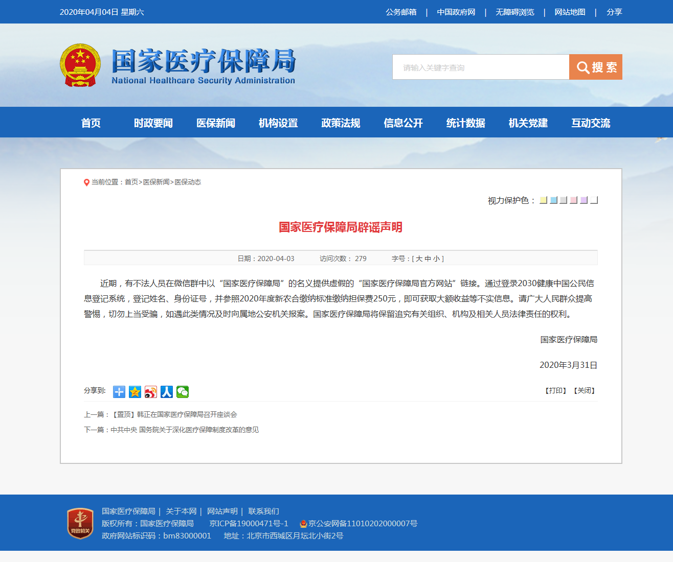 4月3日,國家醫療保障局發(fā)布辟謠聲明:請廣大人民群眾提高警惕,切勿上當受騙,如遇此類(lèi)情況及時(shí)向屬地公安機關(guān)報案。國家醫療保障局將保留追究有關(guān)組織、機構及相關(guān)人員法律責任的權利。