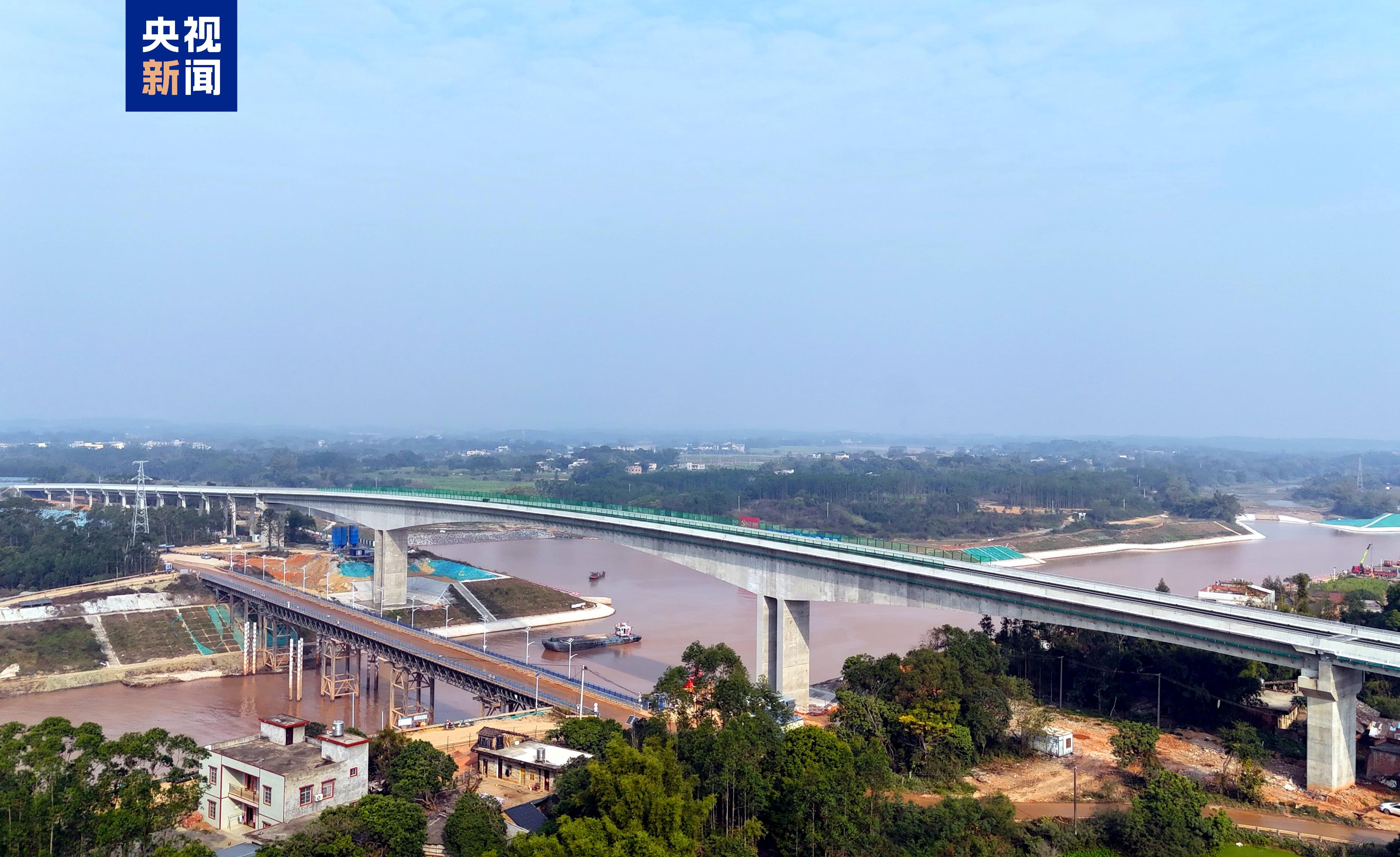 舊州大橋全長(cháng)370米,主跨長(cháng)130米,橋面寬9米,采用雙向2車(chē)道設計,東接舊州鎮,西連074鄉道并銜接賓欽高速,構建起“鎮域道路—鄉道—高速”的無(wú)縫銜接通道,大幅縮短舊州鎮與高速路網(wǎng)的通行距離。