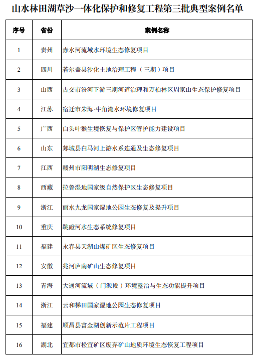 圖為山水林田湖草沙一體化保護和修復工程第三批典型案例名單。圖片來(lái)源:財政部
