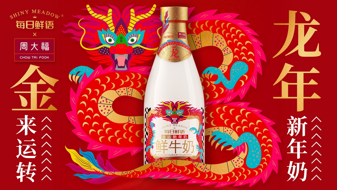 品牌跨界聯(lián)名,不斷活化品牌,帶來(lái)增益轉化。春節期間,每日鮮語(yǔ)攜手周大福,推出“金運新年奶”,開(kāi)啟“龍來(lái)運轉”新一年,為消費者帶來(lái)“黃金”營(yíng)養。