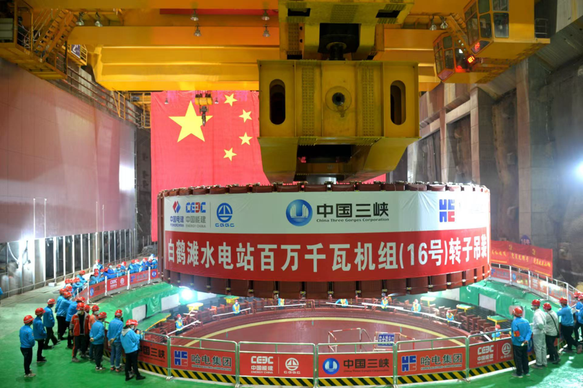 圖為白鶴灘水電站百萬(wàn)千瓦機組轉子吊裝。