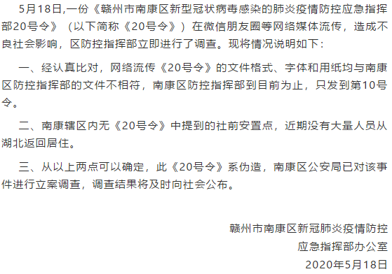 據中共贛州市南康區委宣傳部官微“南康發(fā)布”5月19日消息,贛州市南康區新冠肺炎疫情防控應急指揮部辦公室稱(chēng),5月18日,一份《贛州市南康區新型冠狀病毒感染的肺炎疫情防控應急指揮部20號令》(以下簡(jiǎn)稱(chēng)《20號令》)在微信朋友圈等網(wǎng)絡(luò )媒體流傳,造成不良社會(huì )影響,南康區防控指揮部立即進(jìn)行了調查?,F將情況說(shuō)明如下: