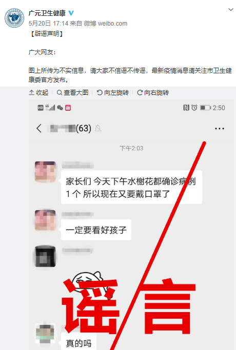 5月20日,四川省廣元市衛生健康委員會(huì )官方微博@廣元衛生健康發(fā)布辟謠聲明稱(chēng),網(wǎng)傳“廣元市水榭花都小區確診一新冠肺炎病例”為謠言。
