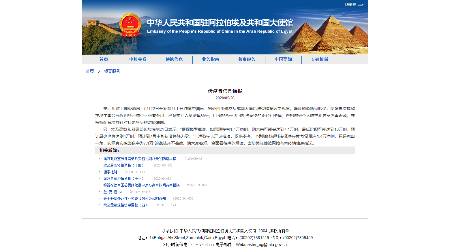 此外,駐埃大使館提醒,據四川省衛健委消息,5月22日開(kāi)羅齋月十日城某中國員工搭乘四川航空從成都入境后接受隔離醫學(xué)觀(guān)察,確診感染新冠肺炎。使館再次提醒在埃中國公民近期務(wù)必減少不必要外出,嚴禁前往人員密集場(chǎng)所,自我排查一切可能被感染的路徑和渠道,嚴格做好個(gè)人防護和居室消毒殺菌,并積極配合埃方針對特定場(chǎng)所的防疫舉措。