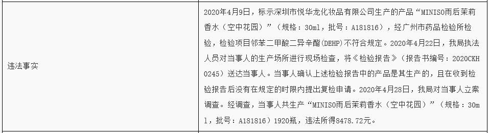 廣東省藥品監督管理局官網(wǎng)公布的行政處罰決定書(shū)顯示,2020年4月9日,標示深圳市悅華龍化妝品有限公司生產(chǎn)的產(chǎn)品“MINISO雨后茉莉香水(空中花園)”(規格:30ml,批號:A181816),經(jīng)廣州市藥品檢驗所檢驗,檢驗項目鄰苯二甲酸二異辛酯(DEHP)不符合規定。