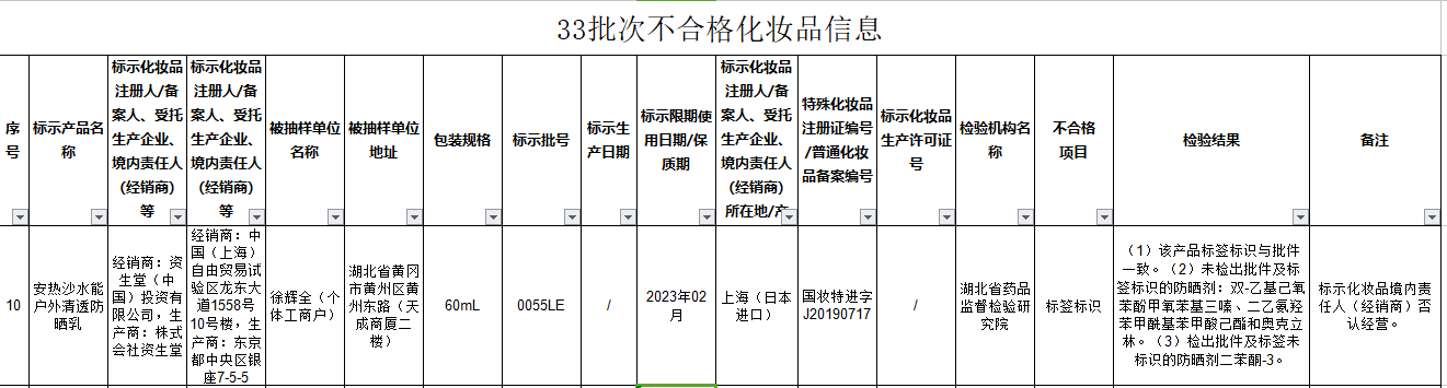 通告顯示,經(jīng)湖北省藥品監督檢驗研究院檢測,經(jīng)銷(xiāo)商為資生堂(中國)投資有限公司,生產(chǎn)商為株式會(huì )社資生堂銷(xiāo)售的產(chǎn)品安熱沙水能戶(hù)外清透防曬乳產(chǎn)品不合格,檢驗結果為未檢出批件及標簽標識的防曬劑:雙-乙基己氧苯酚甲氧苯基三嗪、二乙氨羥苯甲?;郊姿峒乎ズ蛫W克立林;檢出批件及標簽未標識的防曬劑二苯酮-3。