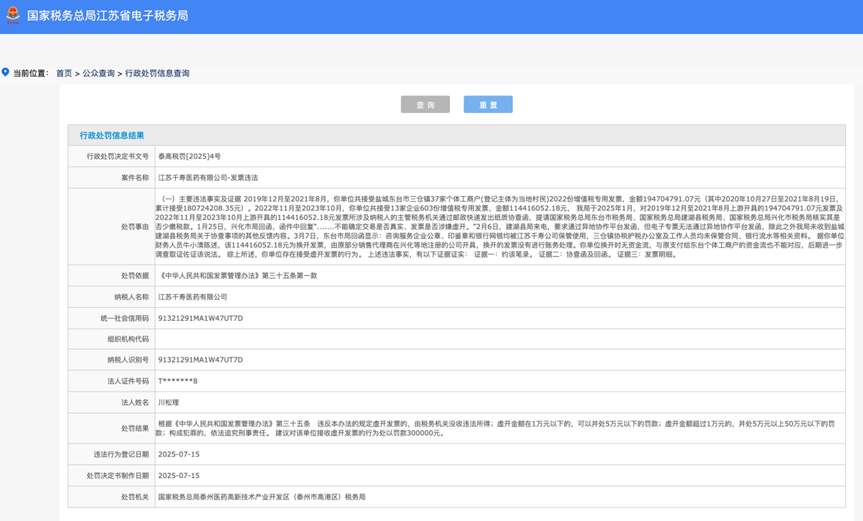 《中國經(jīng)營(yíng)報》記者查詢(xún)國家稅務(wù)總局江蘇省電子稅務(wù)局、信用中國等網(wǎng)站發(fā)現,7月15日,國家稅務(wù)總局泰州醫藥高新技術(shù)產(chǎn)業(yè)開(kāi)發(fā)區(泰州市高港區)稅務(wù)局對江蘇千壽醫藥發(fā)票違法行為進(jìn)行行政處罰,處罰金額為30萬(wàn)元。
