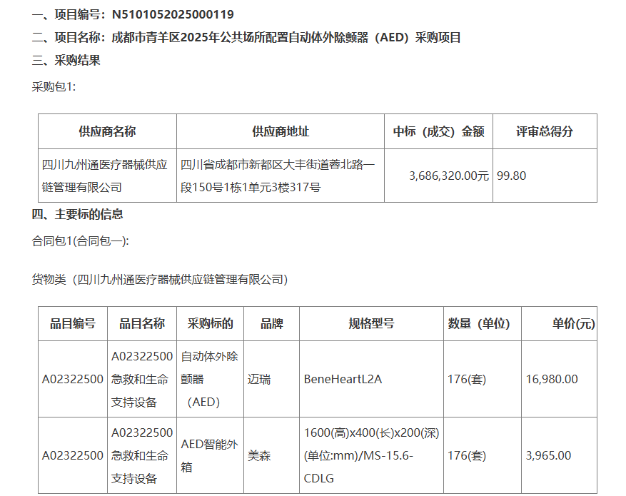 公告顯示,四川九州通醫療器械供應鏈管理有限公司以99.80的評審總得分中標,中標(成交)金額為3686320.00元,將供應176()邁瑞公司的自動(dòng)體外除顫器(AED),單價(jià)為16980.00元;供應176()美森公司的AED智能外箱,單價(jià)為3965.00元。