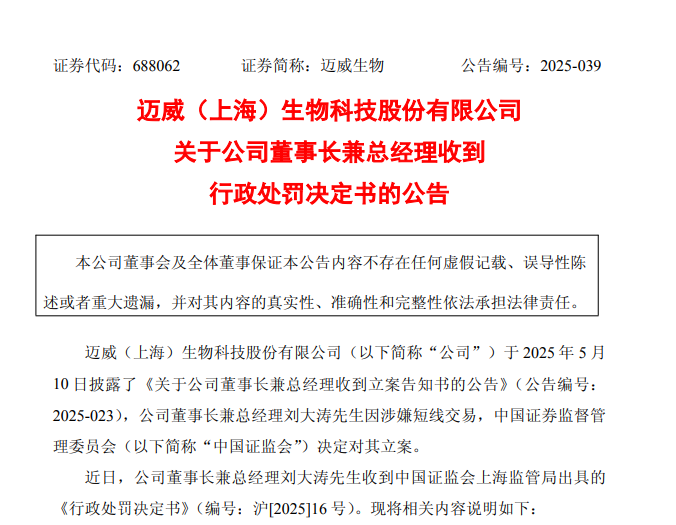 中國經(jīng)濟網(wǎng)北京87日訊(記者 郭文培)85日,邁威(上海)生物科技股份有限公司(以下簡(jiǎn)稱(chēng)邁威生物)披露公告,由于短線(xiàn)交易,近日公司董事長(cháng)兼總經(jīng)理劉大濤收到中國證監會(huì )上海監管局出具的《行政處罰決定書(shū)》,劉大濤被警告并處以六十萬(wàn)元罰款。