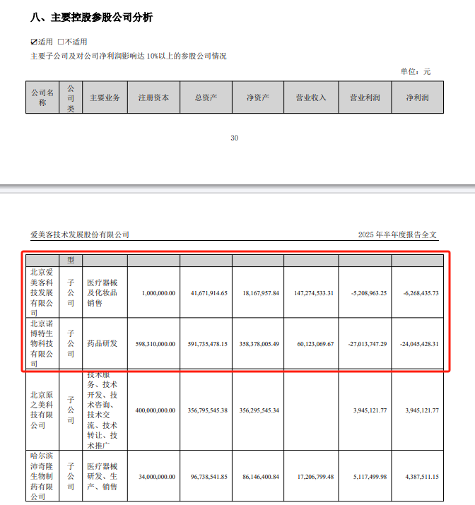 具體來(lái)看,其主要控股參股公司表現并不樂(lè )觀(guān)。半年報顯示,愛(ài)美客主要子公司及對公司凈利潤影響達10%以上的參股公司有4家,其中2家處于虧損狀態(tài)。北京愛(ài)美客科技發(fā)展有限公司凈利潤為-6268435.73元,北京諾博特生物科技有限公司凈利潤為-24045428.31元,2家虧損金額逾3000萬(wàn)元。
