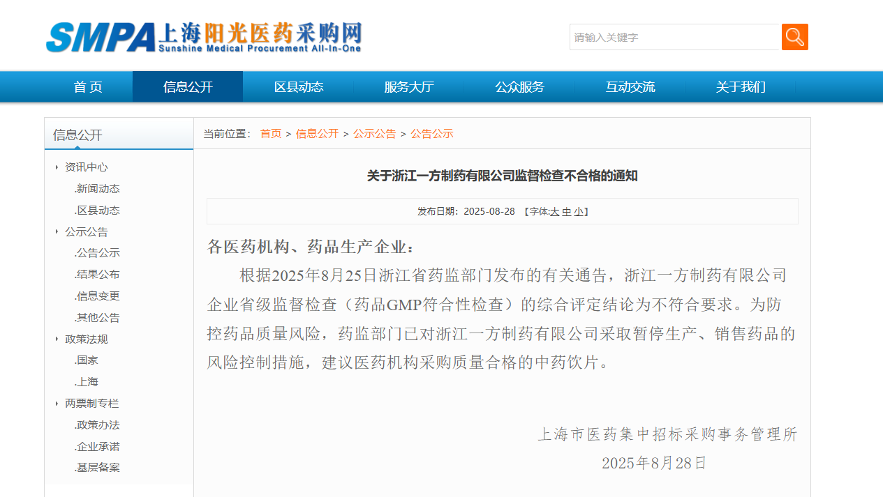通知顯示,上海市醫藥集中招標采購事務(wù)管理所提示各醫藥機構、藥品生產(chǎn)企業(yè):根據2025年8月25日浙江省藥監部門(mén)發(fā)布的有關(guān)通告,浙江一方制藥有限公司企業(yè)省級監督檢查(藥品GMP符合性檢查)的綜合評定結論為不符合要求。為防控藥品質(zhì)量風(fēng)險,藥監部門(mén)已對浙江一方制藥有限公司采取暫停生產(chǎn)、銷(xiāo)售藥品的風(fēng)險控制措施,建議醫藥機構采購質(zhì)量合格的中藥飲片。