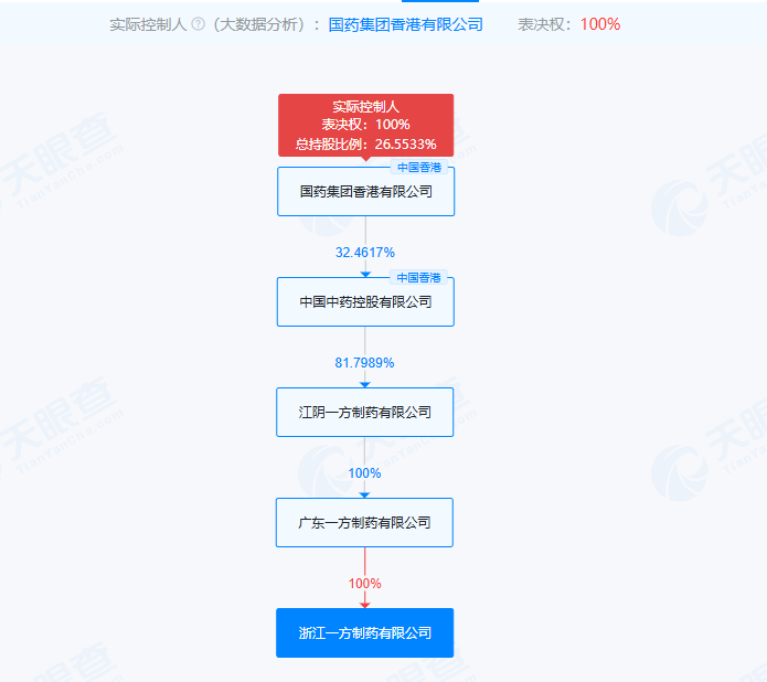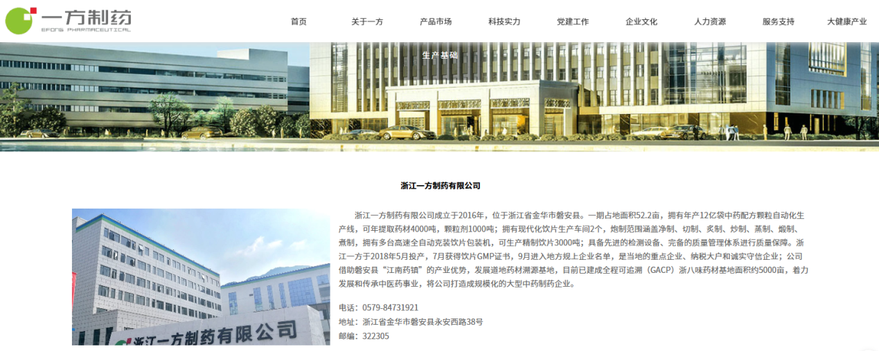 一方制藥官網(wǎng)介紹,浙江一方制藥有限公司成立于2016年,位于浙江省金華市磐安縣,公司于2018年5月投產(chǎn),7月獲得飲片GMP證書(shū),9月進(jìn)入地方規上企業(yè)名單,是當地的重點(diǎn)企業(yè)、納稅大戶(hù)和誠實(shí)守信企業(yè)。天眼查顯示,國藥集團香港有限公司為浙江一方制藥有限公司實(shí)控人。