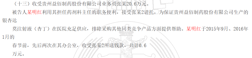 根據判決書(shū),被告人某明紅利用其擔任藥劑科主任的職務(wù)便利,接受貴州益佰制藥股份有限公司業(yè)務(wù)員“張某2”請托,為保證貴州益佰制藥股份有限公司生產(chǎn)的銀杏達莫注射液(杏?。┰卺t院充足供應,排除采購其他同類(lèi)競爭產(chǎn)品方面提供幫助。某明紅于20159月、20161月的春節前,先后兩次在其辦公室,收受“張某2”所送錢(qián)款,共計0.6萬(wàn)元。