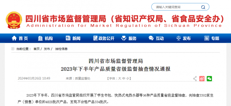 2023年下半年,四川省市場(chǎng)監管局組織開(kāi)展了學(xué)生書(shū)包、快熱式電熱水器等96種產(chǎn)品質(zhì)量省級監督抽查,共抽查3302家生產(chǎn)(銷(xiāo)售)單位的4828批次產(chǎn)品,發(fā)現不合格產(chǎn)品334批次。