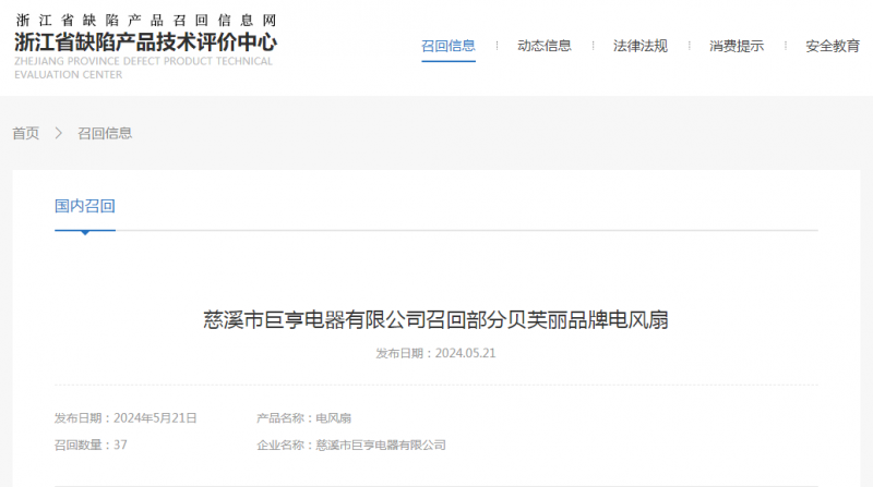 日前,慈溪市巨亨電器有限公司按照《消費品召回管理暫行規定》的要求,主動(dòng)向浙江省市場(chǎng)監督管理局和寧波市市場(chǎng)監督管理局報告了召回計劃,將自即日起,召回2023年5月15日至2023年6月10日期間制造的部分貝芙麗牌B280型號電風(fēng)扇,涉及數量為37臺。