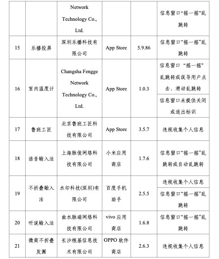 工信部稱(chēng),依據《個(gè)人信息保護法》《網(wǎng)絡(luò )安全法》《電信條例》《電信和互聯(lián)網(wǎng)用戶(hù)個(gè)人信息保護規定》等法律法規,工信部持續整治APP侵害用戶(hù)權益的違規行為,在近期組織的第三方檢測機構進(jìn)行抽查中,共發(fā)現27款APP及SDK存在侵害用戶(hù)權益行為。侵權方式包括信息窗口“搖一搖”亂跳轉或誤導用戶(hù)滑動(dòng)亂跳轉、違規收集個(gè)人信息、APP頻繁自啟動(dòng)和關(guān)聯(lián)啟動(dòng)、信息窗口未提供關(guān)閉或退出標識、強制用戶(hù)使用定向推送功能、SDK信息公示不到位以及強制、頻繁、過(guò)度索取權限等,涉及小米商店語(yǔ)音輸入法、vivo應用商店的聽(tīng)說(shuō)輸入法、App Stroe的樂(lè )播投屏等。