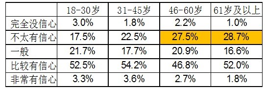 就未來(lái)一年食品安全狀況改善的信心來(lái)看,46歲以上年齡較大的市民對未來(lái)改善的信心不足。