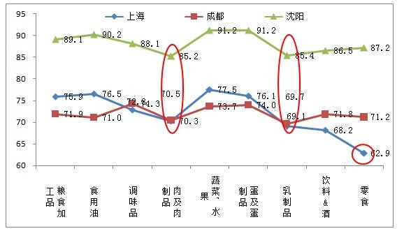 附圖 上海、成都、沈陽(yáng)三城市各類(lèi)食品目前的安全信心指數